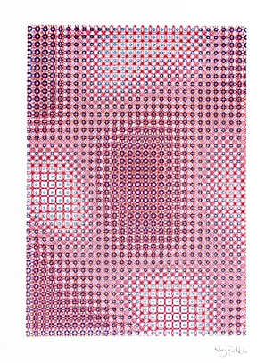 Each piece begins as an algorithm: a set of rules written and designed by the artist. A drawing machine executes those rules, line by line, directly onto paper with real ink. Every decision of form, color, and composition is entirely human.